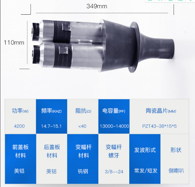 銘揚15K 超聲波換能器"的總頻差為0.00001(MHz),溫度頻差是0.00001(MHz),輸出阻抗為0.015(kΩ),調整頻差是0.0005(MHz),基準溫度為20(℃),激勵電平是0(mW),插入損耗為0(dB),負載諧振電阻是15(Ω),標稱頻率為0.015(MHz),種類是換能器,加工定制為是,負載電容是(pF),輸入阻抗為0.015(kΩ),型號是YP-6015-6D,阻帶衰減為0(dB)